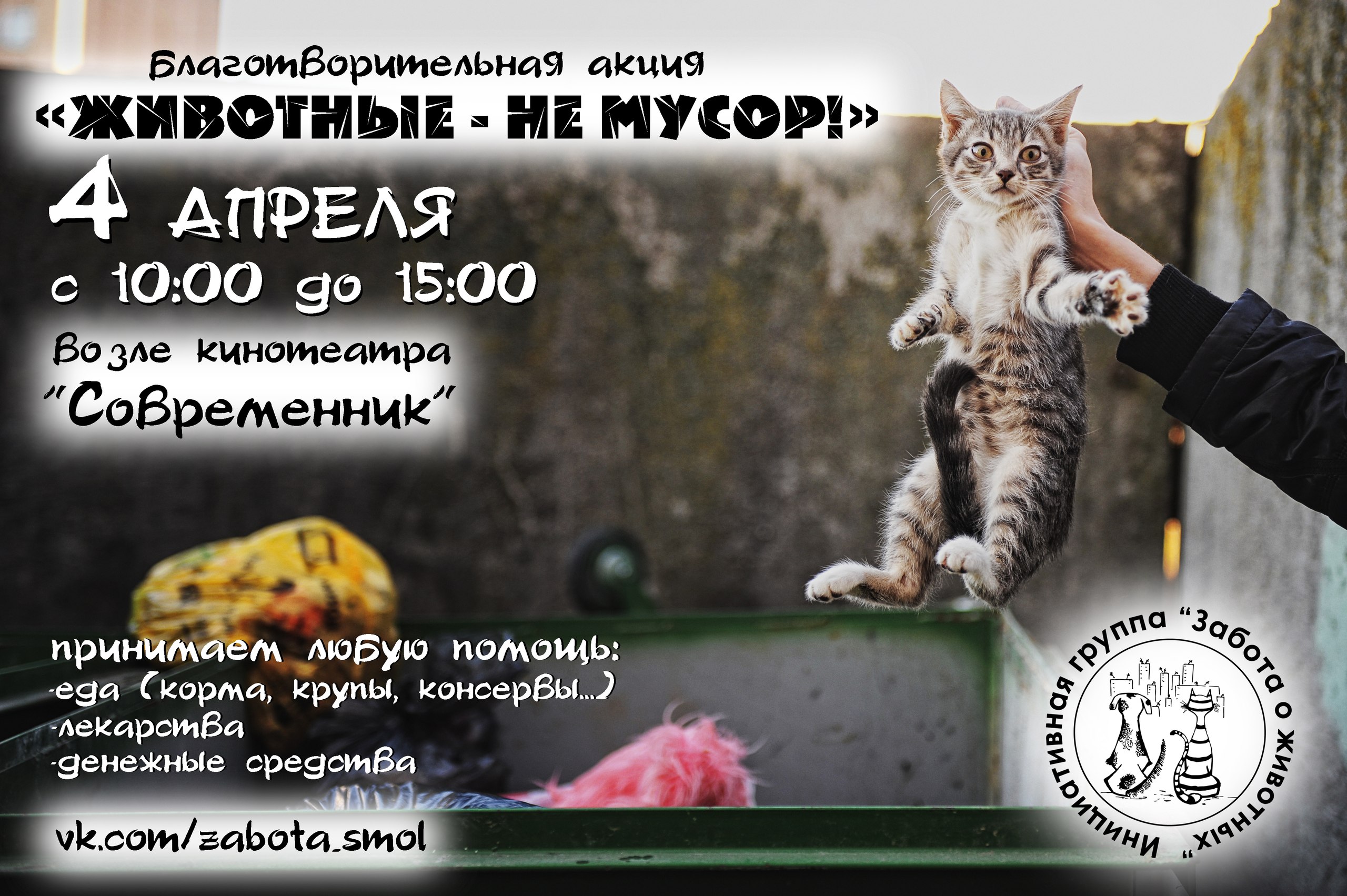 "Животные - не мусор!" - такой в этот раз девиз нашей акции! С приходом весны на улицах появляется все больше щенков и котят! И не только потому, что их рожают бездомные кошки и собаки, но и потому, что человек с жестокостью выбрасывает их от своих домашних (загулявших и не стерилизованных) питомцев! Мы призываем вас быть ответственными, не увеличивать численность, и так никому не нужных, бездомышей!